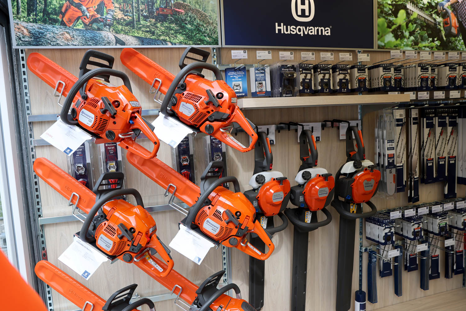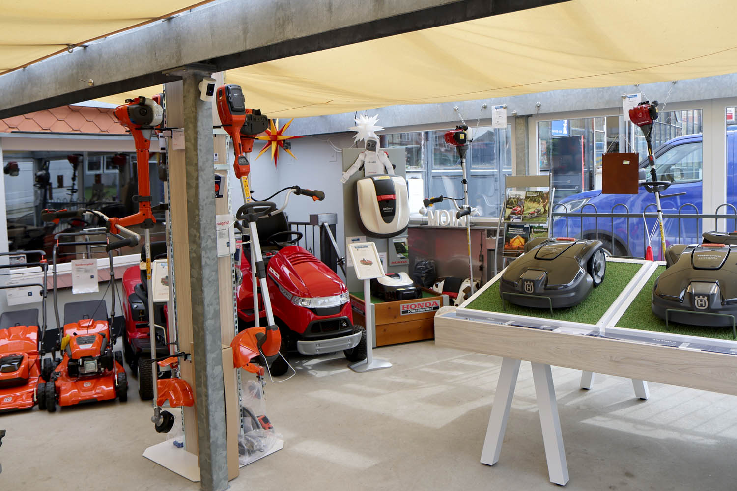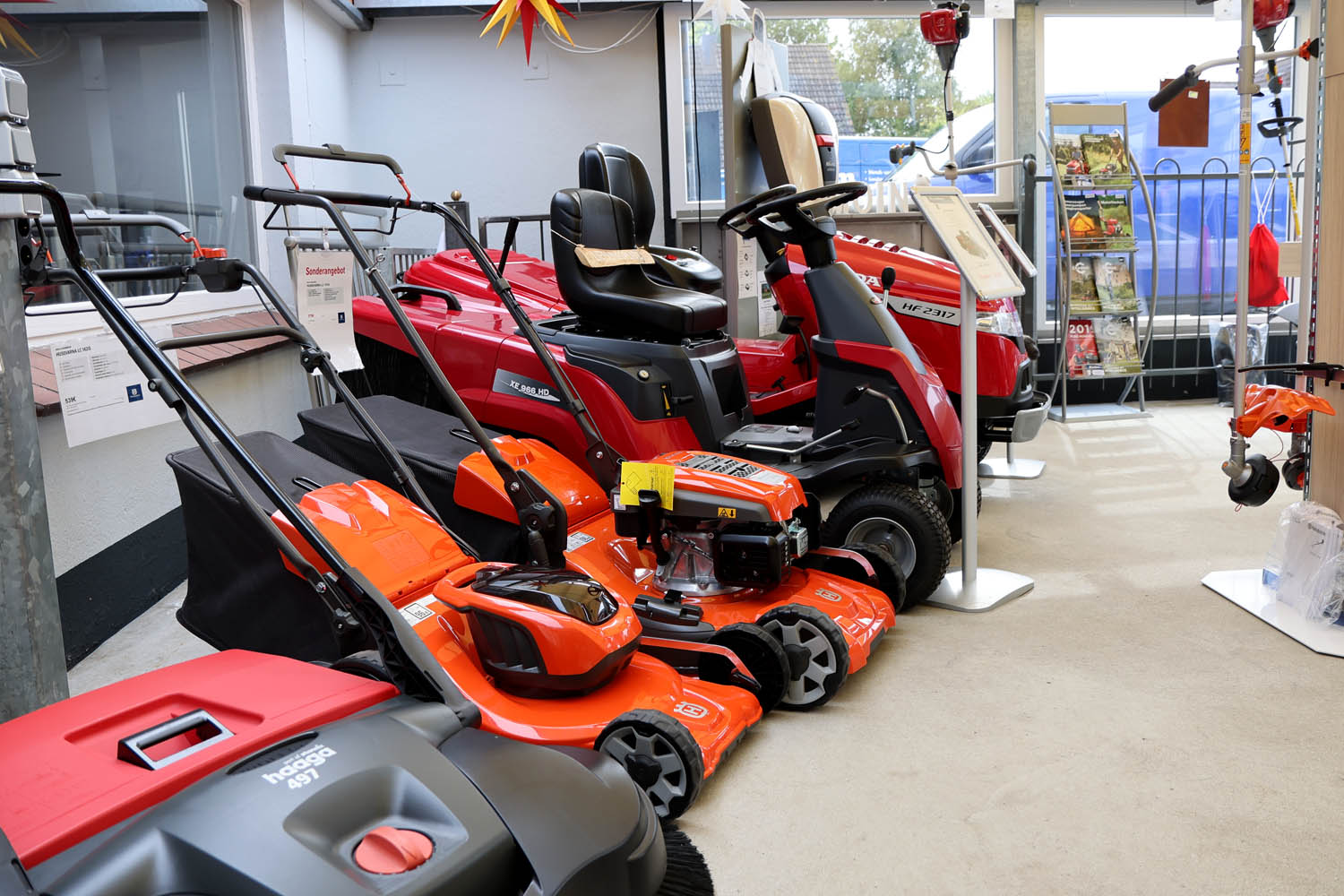 Im Verkaufsbereich werden Garten- und Kleingeräte, Rasenmäher und – besonders im Herbst – eine große Vielfalt an Herrnhuter Sternen angeboten.